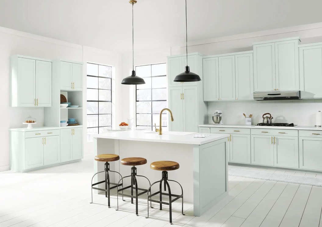 Bên cạnh đó, hãng sơn Behr cũng vừa vinh danh màu xanh bạc hà nhàn nhạt – Breezeway – làm màu đại diện 2022 của họ. Đây là một gam màu được pha trộn giữa xanh lam và xanh lá, được lấy cảm hứng từ vẻ đẹp của Trái Đất và sắc xanh phản chiếu, gợi nhớ đến thủy tinh nước biển được tìm thấy dọc theo những bãi biển đầy cát và làn nước trong như pha lê tuyệt đẹp. Gam màu xanh Breezeway mang lại cảm giác mát mẻ, bình yên đồng thời cũng đại diện cho những ham muốn mãnh liệt để vươn mình lên tiến về phía trước và khám phá những niềm đam mê mới. Được pha trộn với các điểm nhấn màu trắng sáng và đen tuyền, Breezeway mang đến sự tương phản với vẻ ngoài sạch sẽ, hoàn hảo cho khu vực lối vào hoặc nhà bếp của bạn. Chẳng hạn như, trang trí tủ bếp với tông màu đặc biệt này và hoàn thiện với tay nắm tủ bằng kim loại màu vàng gold kết hợp thêm mặt bàn màu trắng thạch anh nhân tạo sáng bóng để tạo nên nét sang trọng cho không gian bếp nhà bạn. Màu sắc nhẹ nhàng, mát mẻ mang lại cảm giác miền biển rõ rệt, nhưng nó cũng kết hợp tuyệt vời với các thiết kế hiện đại và lấy cảm hứng từ cổ điển.